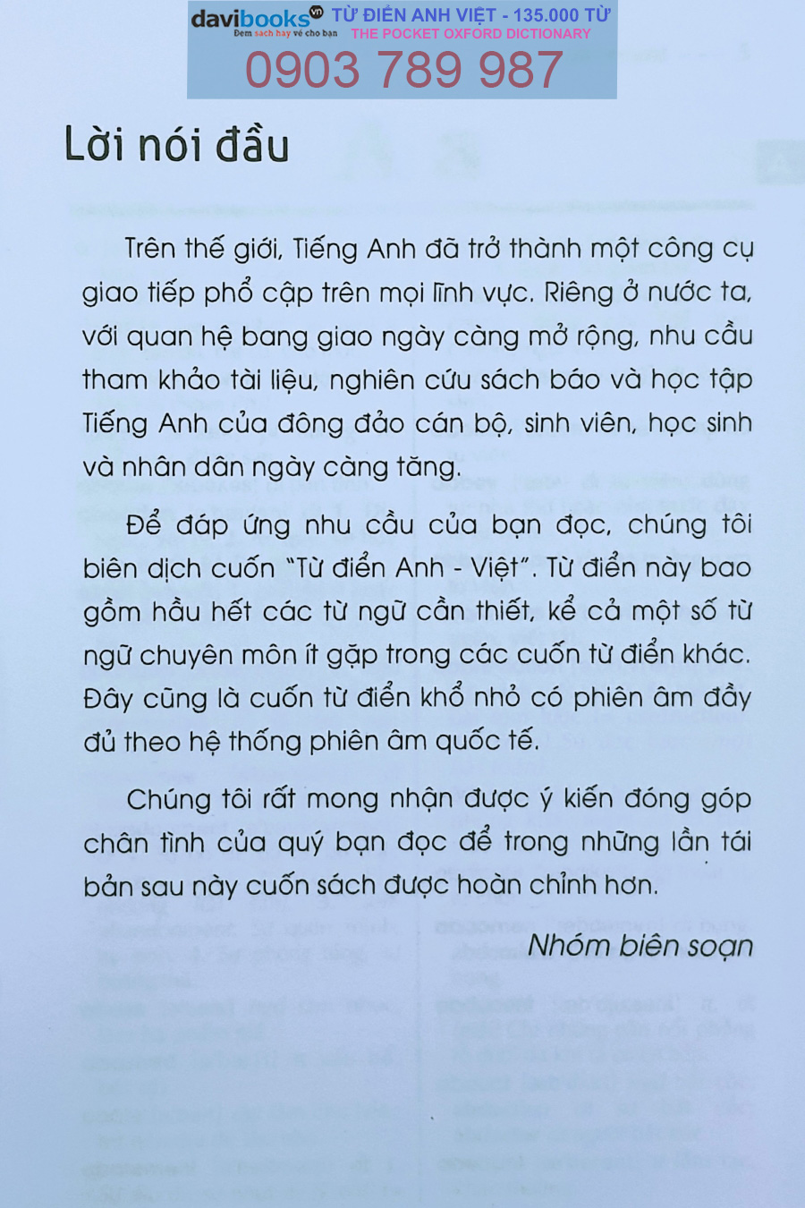 Để giúp cho việc học tiếng Anh - một ngôn ngữ phổ biến và thông dụng nhất hiện nay. sớm đạt được kết quả mong muốn, chúng tôi đã tổ chức biên soạn khá công phu, với tất cả năng lực và trách nhiệm của mình để hán hạnh gửi đến quý độc giả một cuốn từ điển đáp ứng tương đối đầy đủ nhất những yêu cầu trong việc học tập, tra cứu, dịch thuật...