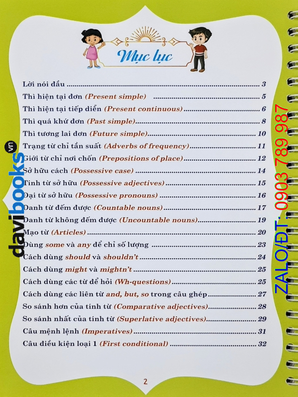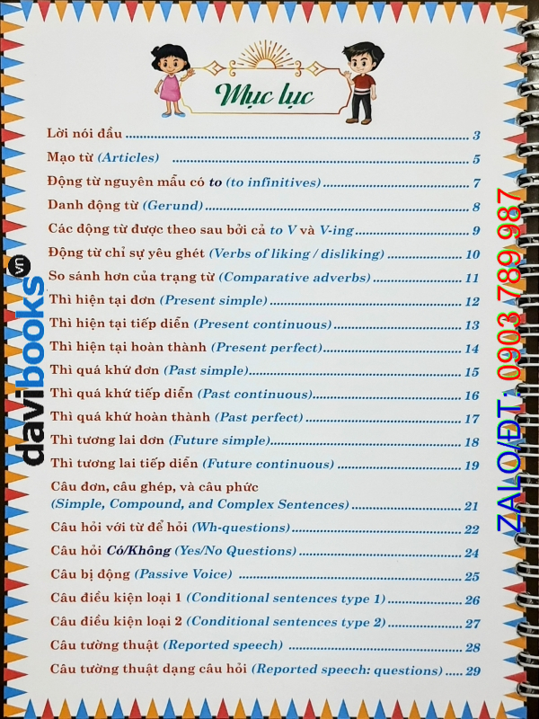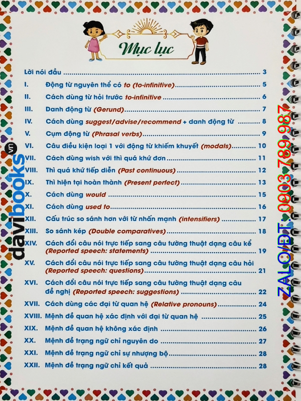 Sách tóm tắt các điểm ngữ pháp theo kiểu ghi chú ngắn gọn, giúp các bạn dễ dàng ghi nhớ Động từ nguyên thể có to (to-infinitive); Cách dùng từ hỏi trước to-infinitive; Danh động từ (Gerund); Cách dùng suggest/advise/recommend + danh động từ; Cụm động từ (Phrasal verbs); Câu điều kiện loại 1 với động từ khiếm khuyết (modals); Cách dùng wish với thì quá khứ đơn; Thì quá khứ tiếp diễn (Past continuous); Thì hiện tại hoàn thành (Present perfect); Cách dùng would; Cách dùng used to; Cấu trúc so sánh hơn với từ nhấn mạnh (intensifiers); So sánh kép (Double comparatives); Cách đổi câu nói trực tiếp sang câu tường thuật dạng câu kể (Reported speech: statements); Cách đổi câu nói trực tiếp sang câu tường thuật dạng câu hỏi (Reported speech: questions); Cách đổi câu nói trực tiếp sang câu tường thuật dạng câu đề nghị (Reported speech: suggestions); Cách dùng các đại từ quan hệ (Relative pronouns); Mệnh đề quan hệ xác định với đại từ quan hệ; Mệnh đề quan hệ không xác định; Mệnh đề trạng ngữ chỉ nguyên do; Mệnh đề trạng ngữ chỉ sự nhượng bộ; Mệnh đề trạng ngữ chỉ kết quả cùng các điểm ngữ pháp khác trong chương trình tiếng Anh lớp 9.