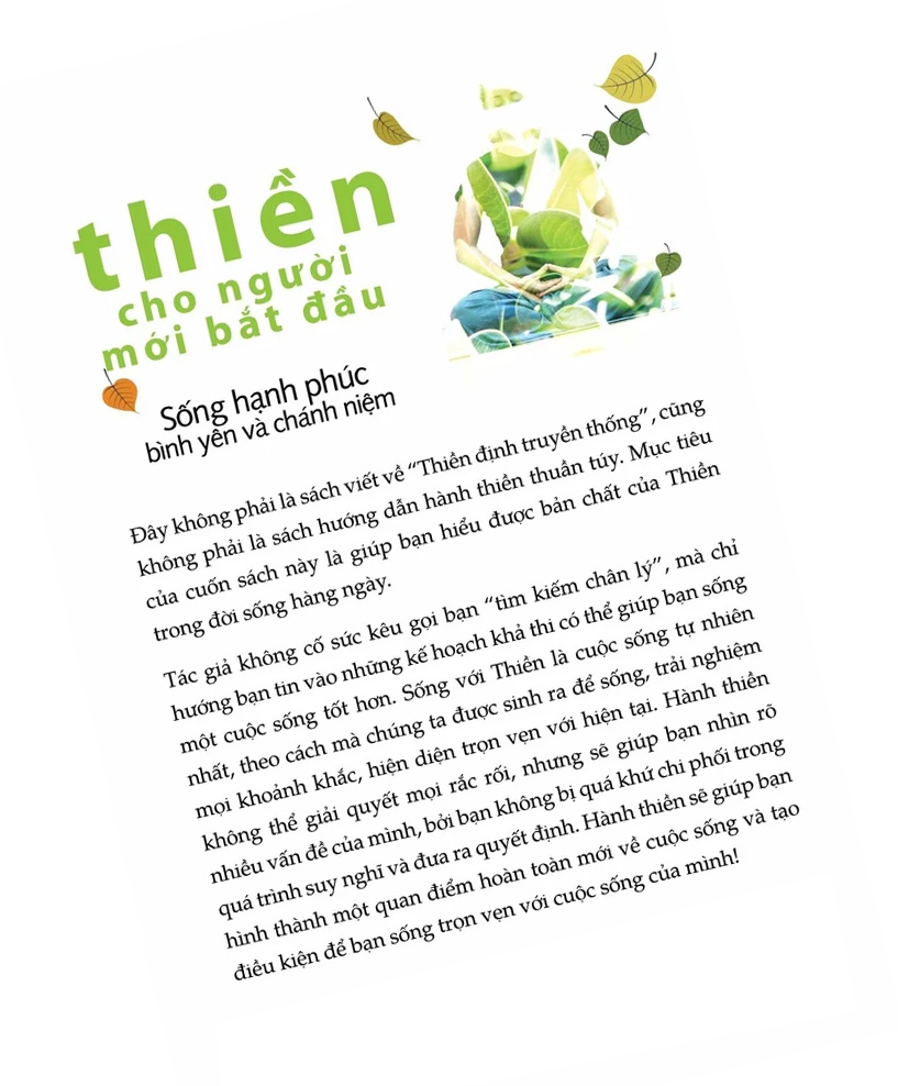 Đây không phải là sách viết về “Thiền định truyền thống”, cũng không phải là sách hướng dẫn hành thiền thuần túy. Mục tiêu của cuốn sách này là giúp bạn hiểu được bản chất của Thiền trong đời sống hàng ngày.