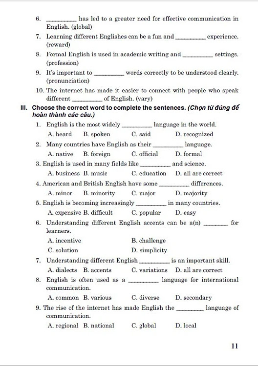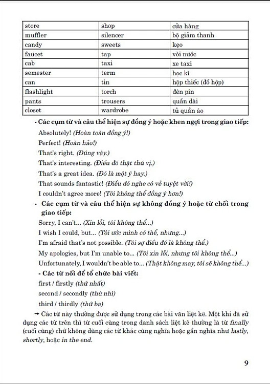 Ngoài ra, còn có phần đáp án gợi ý ở cuối sách để các em có thể tham khảo, đối chiếu sau khi làm xong các bài tập, xem phần trả lời của mình đã đúng hay chưa. Nếu chưa đúng thì cần phải xác định tại sao chưa đúng để có sự chỉnh sửa kịp thời, từ đó dần tiến bộ hơn. Nắm vững từ vựng và cấu trúc ngữ pháp trong cuốn sách này thì chắc chắn việc học các kĩ năng nghe, nói, đọc, viết trong sách giáo khoa Tiếng Anh 9 sẽ trở nên dễ dàng hơn với các em.