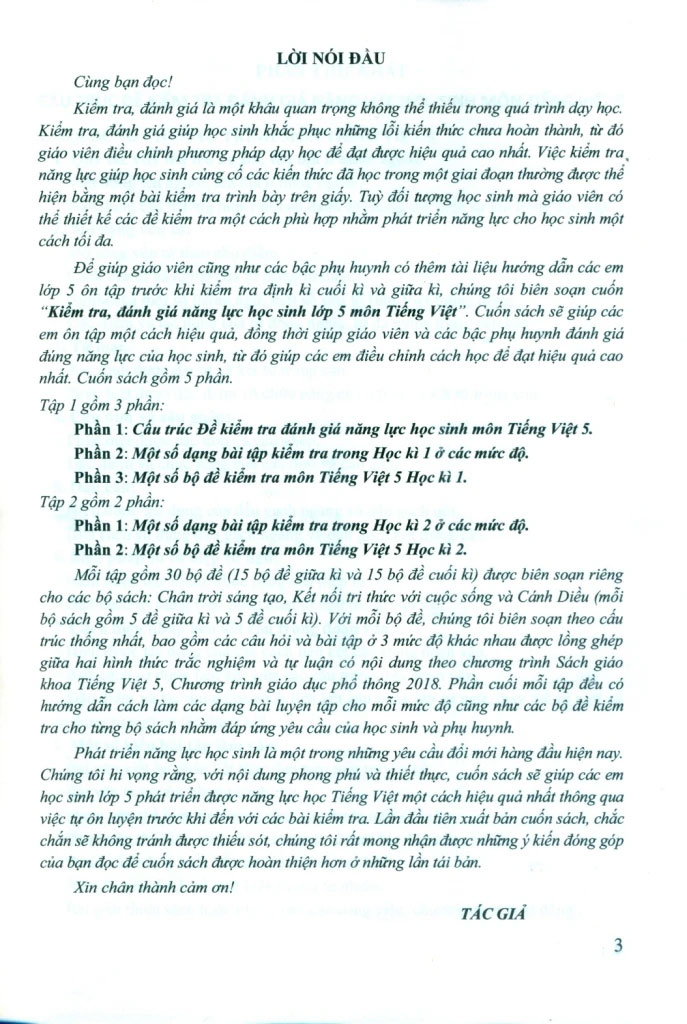 Phát triển năng lực học sinh là một trong những yêu cầu đổi mới hàng đầu hiện nay.Chúng tôi hi vọng rằng, với nội dung phong phú và thiết thực, cuốn sách sẽ giúp các emhọc sinh lớp 5 phát triển được năng lực học Tiếng Việt một cách hiệu quả nhất thông quaviệc tự ôn luyện trước khi đến với các bài kiểm tra. Lần đầu tiên xuất bản cuốn sách, chắcchắn sẽ không tránh được thiếu sót, chúng tôi rất mong nhận được những ý kiến đóng góp của bạn đọc để cuốn sách được hoàn thiện hơn ở những lần tái bản.