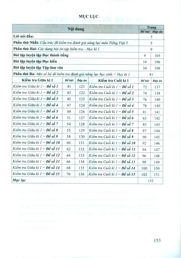 Mỗi tập gồm 30 bộ đề (15 bộ đề giữa kì và 15 bộ để cuối kì) được biên soạn riêngcho các bộ sách: Chân trời sáng tạo, Kết nối tri thức với cuộc sống và Cánh Diều (mỗibộ sách gồm 5 đề giữa kì và 5 đề cuối kì). Với mỗi bộ đề, chúng tôi biên soạn theo cấutrúc thống nhất, bao gồm các câu hỏi và bài tập ở 3 mức độ khác nhau được lồng ghépgiữa hai hình thức trắc nghiệm và tự luận có nội dung theo chương trình Sách giáokhoa Tiếng Việt 5, Chương trình giáo dục phổ thông 2018. Phần cuối mỗi tập đều cóhướng dẫn cách làm các dạng bài luyện tập cho mỗi mức độ cũng như các bộ đề kiểmtra cho từng bộ sách nhằm đáp ứng yêu cầu của học sinh và phụ huynh.