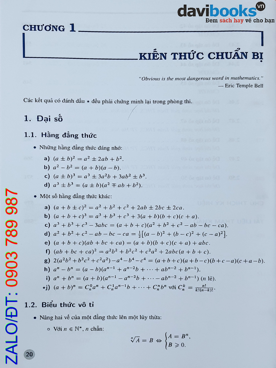 • Chương 1 hệ thống, tóm lược ngắn gọn lại những phần kiến thức quan trọng trong chương trình chuyên toán THCS. Học sinh nên chú ý các phần kiến thức được đánh dấu * đòi hỏi các em phải chứng minh lại khi sử dụng trong thi.